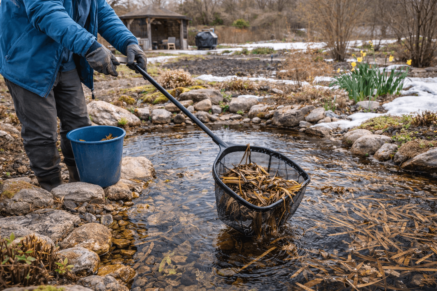 Sobald der Schnee geschmolzen ist und sich die Temperaturen stabil über dem Gefrierpunkt halten, ist es Zeit, den Teich zu überprüfen.